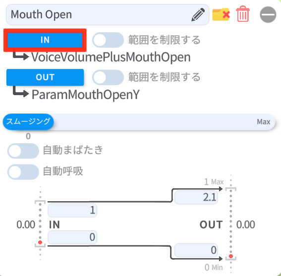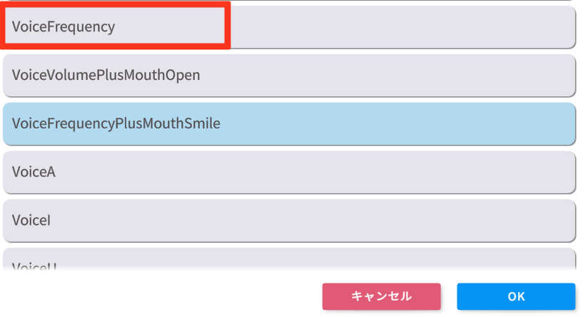 ③MouthOpenでも同様にINボタンを押下し「VoiceFrequency」を選択する(口の開閉設定)
