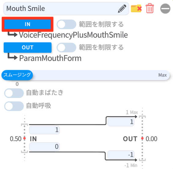 ②MouthSmileのINボタンを押下し「VoiceFrequency」を選択する(口角の設定)